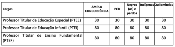 | Professor Titular de Ensino Fundamental (PTEF) | Cadastro reserva | R$ 3.305,33 | Licenciatura plena em Pedagogia |
